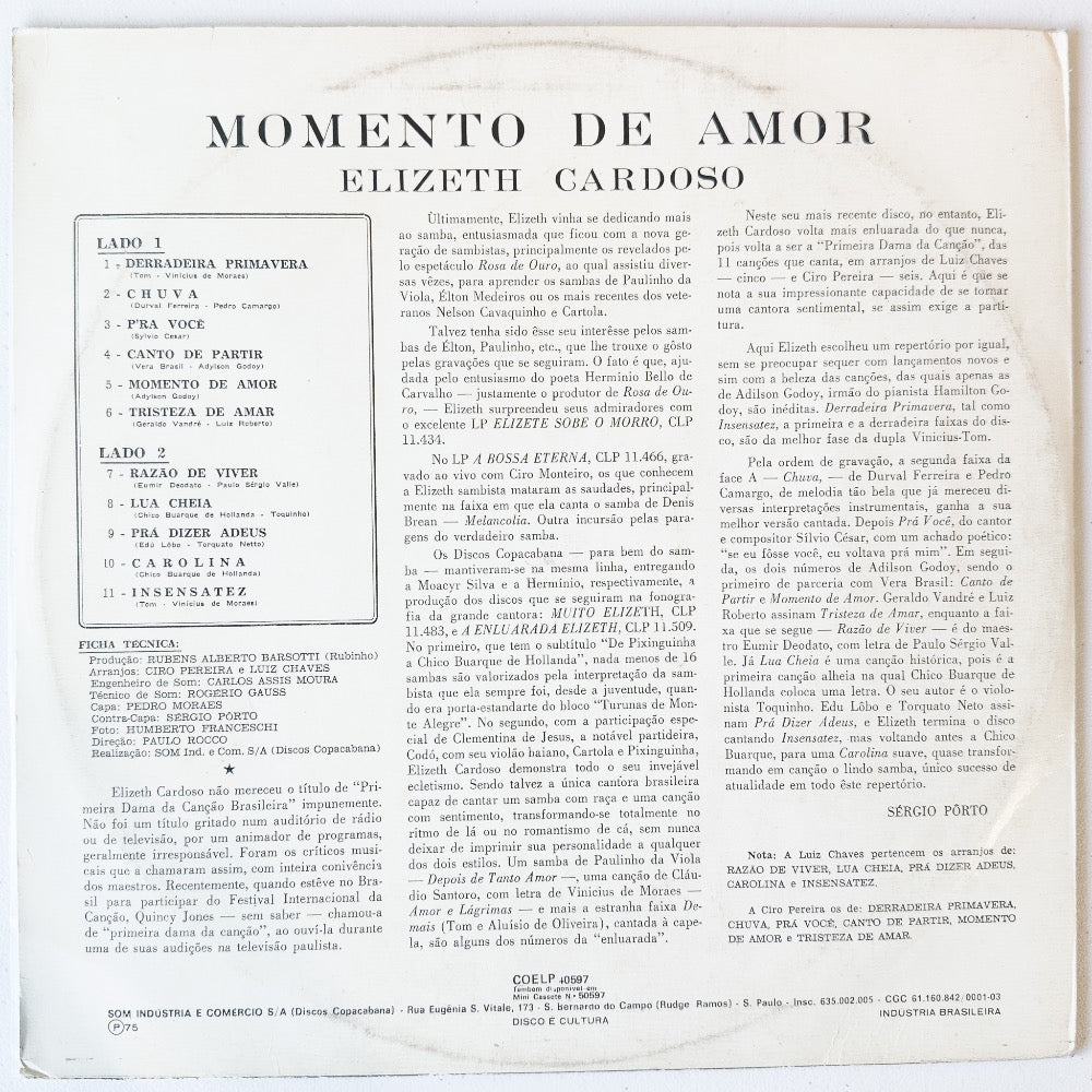 Descubra a magia do samba e da bossa nova com o LP "Momento De Amor" da lendária Elizeth Cardoso. Este álbum icônico, lançado pela gravadora Copacabana, captura a essência da música brasileira com a interpretação única e emocionante de Elizeth. Gravado e prensado no Brasil, este disco de vinil é um tesouro para os amantes da música e colecionadores de LPs. Deixe-se envolver pela voz inconfundível de Elizeth Cardoso e reviva os momentos de amor e nostalgia que só a música brasileira pode proporcionar. Ideal para quem deseja adicionar um toque clássico e sofisticado à sua coleção de discos.
